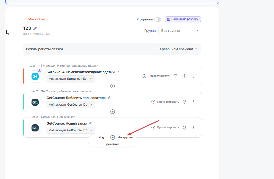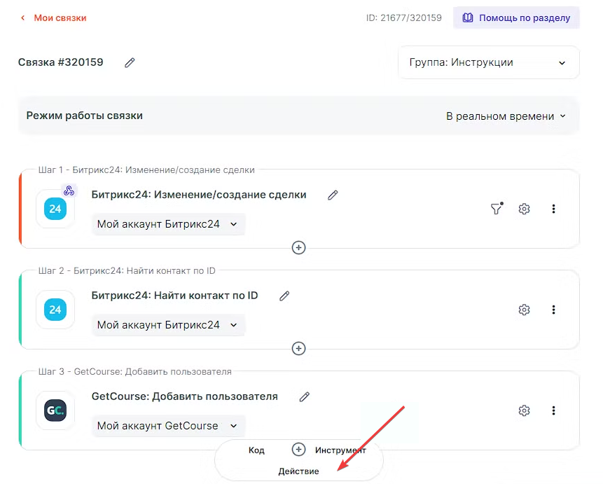 В данной инструкции рассмотрим пример связки, которая будет создавать новый заказ в GetCourse при создании новой сделки в Битрикс24, код предложения для GetCourse находится в разделе товары сделки.