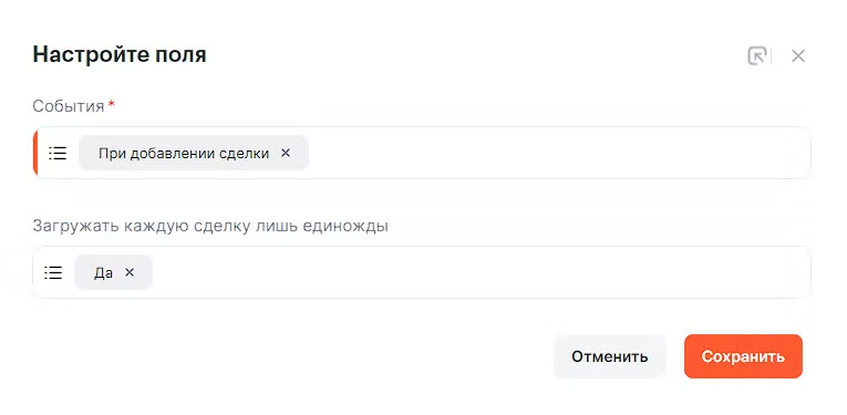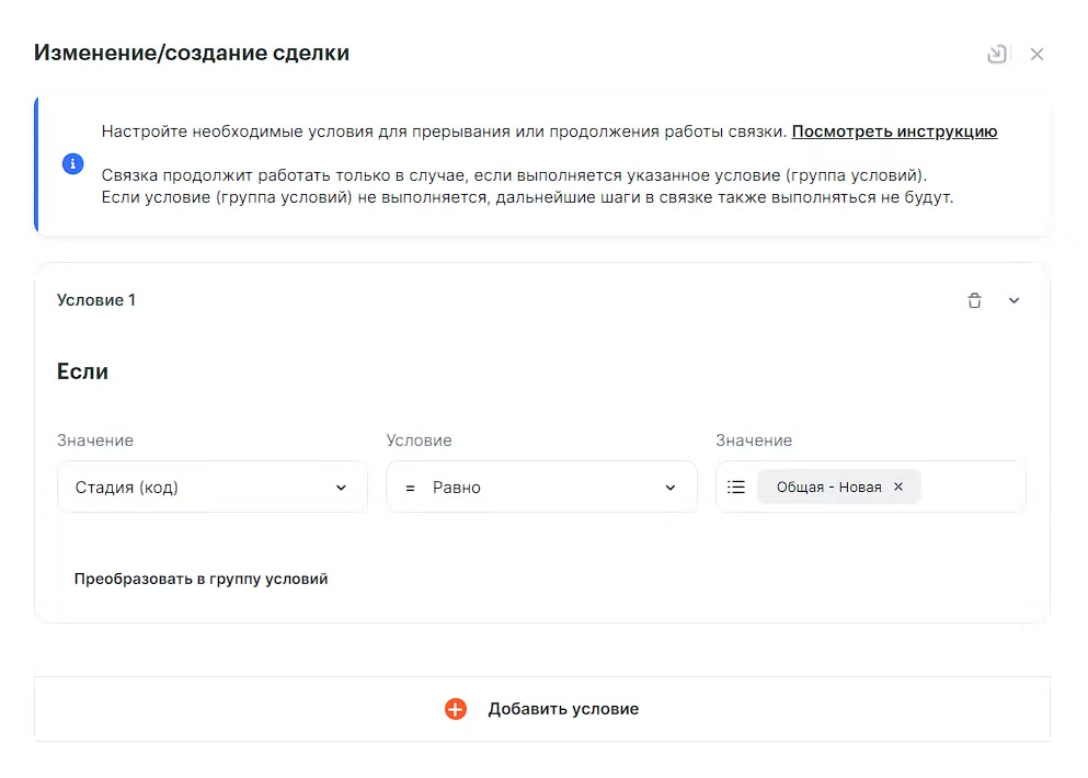 По условию задачи, данные должны пройти по связке только для новой сделки, поэтому настраиваем фильтр входящих данных: