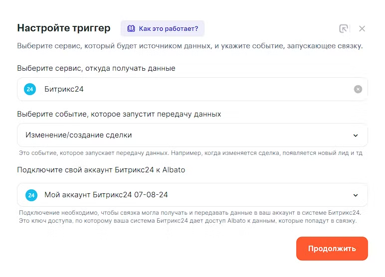 Перед созданием связки убедитесь ,что оба сервиса подключены к Albato.