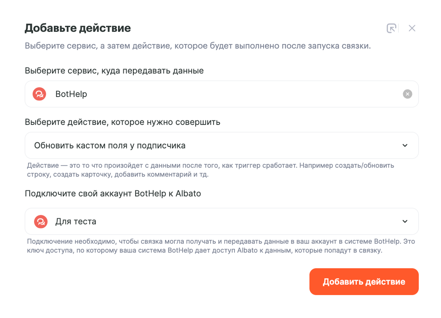 - Действие — BotHelp: Обновить кастом поля у подписчика