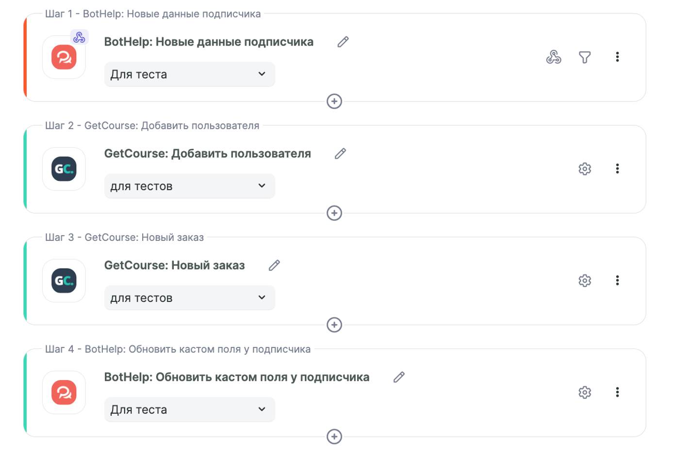 В данной инструкции рассмотрим пример настройки связок, одна из которых при получении телефона от подписчика бота будет создавать пользователя и заказ в Getcourse, а вторая связка будет передавать информацию об оплате заказа в кастомное поле Bothelp для дальнейшего взаимодействия с подписчиком через бота/