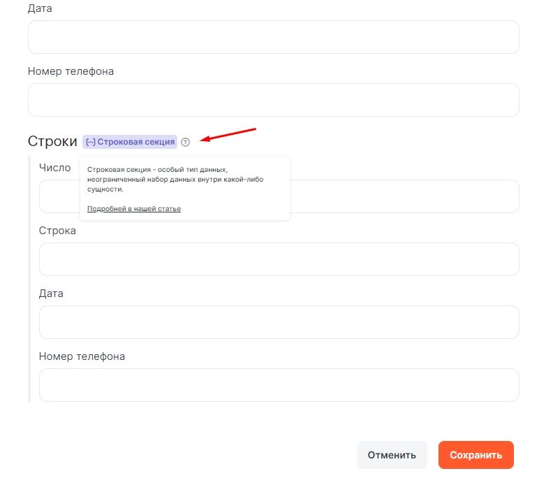 Для удобства в нашем интерфейсе мы отделили Строковые секции от основных полей сущности и сместили немного вправо.