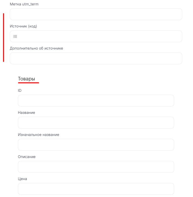 Вы можете увидеть такие настройки для передачи товаров в сделку, позиций в заказ, расходы РК, строки в GoogleSheets и т.д.