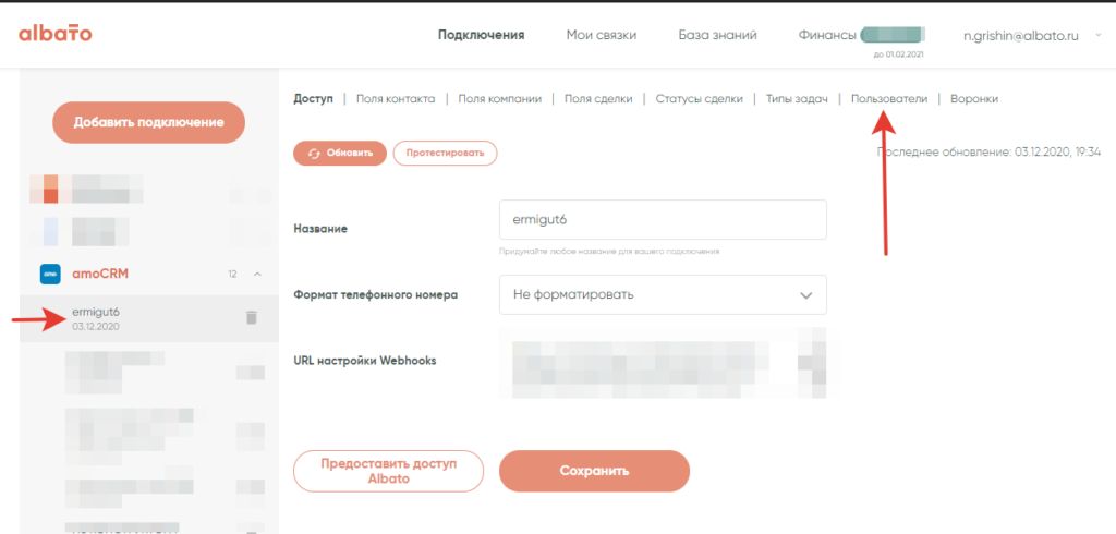 Находим в списке подключений CRM-систему, с которой мы создаем связку (в нашем случае amoCRM) и выбираем наше конкретное подключение. В нем находим раздел «Пользователи».