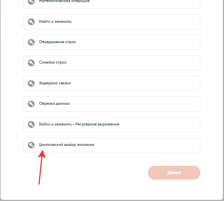 Для использования инструмента «Циклический выбор значения» вам необходимо найти инструмент в разделе «Конструктор связки» и добавить его между шагами.