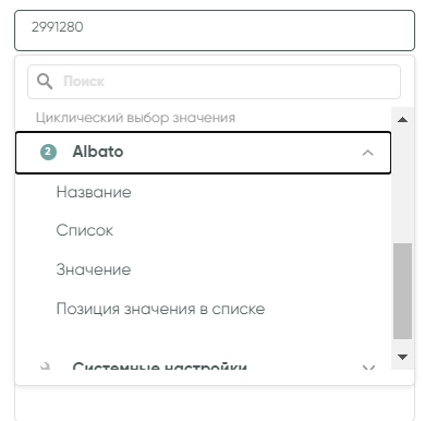 Находим блок данных «Albato — Циклический выбор значения», и в данном блоке выбираем «Значение».