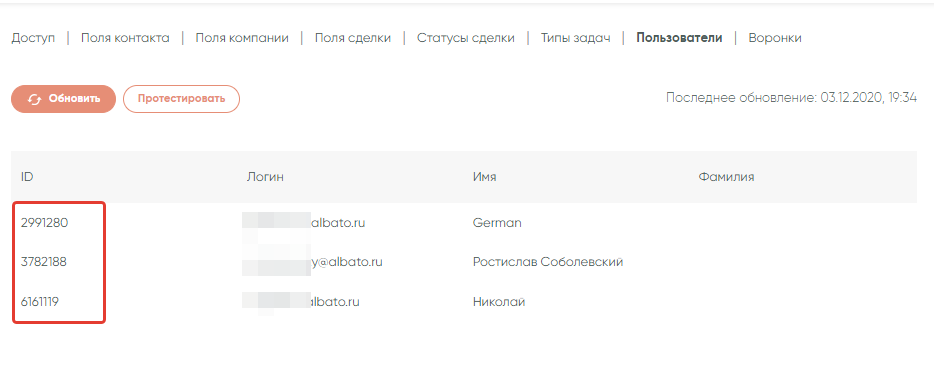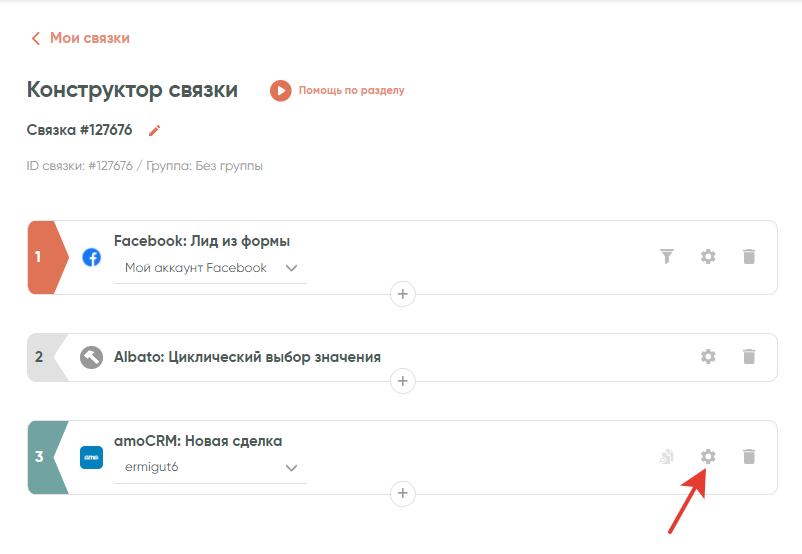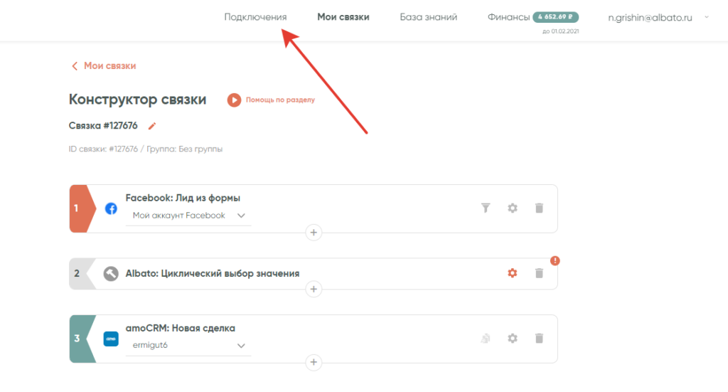 В случае с CRM-системой, который мы приводили в качестве примера, нужно указать список id номеров сотрудников, на которых будут распределяться лиды. Указать имена будет недостаточно, поскольку CRM-система принимает данные только в виде системного id. Данные, которые нам нужны, доступны в разделе подключения. Переходим туда.