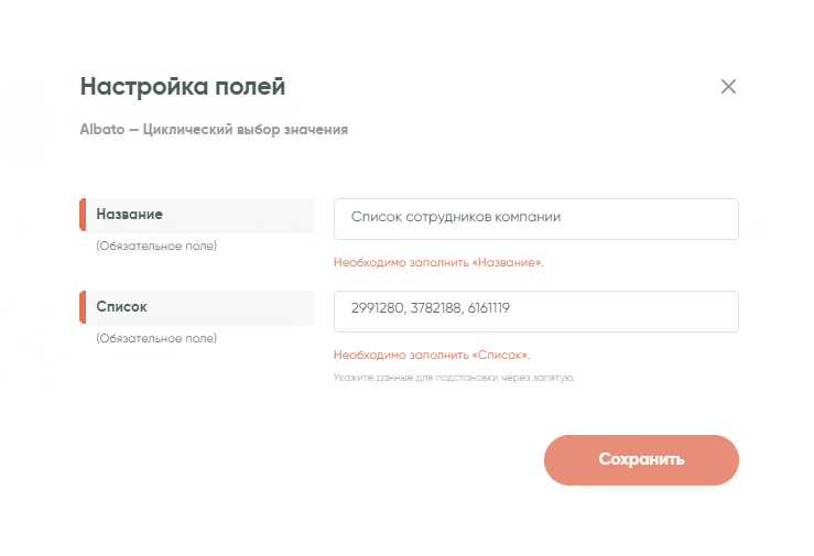 • «Значение» — конкретное значение из списка, которое будет передано при срабатывании связки;