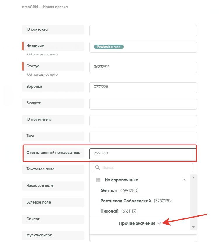Находим поле «Ответственный исполнитель». Кликаем на него и в появившемся окне выбираем «Прочие значения».