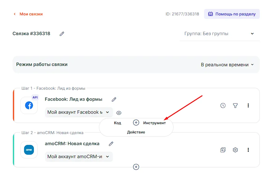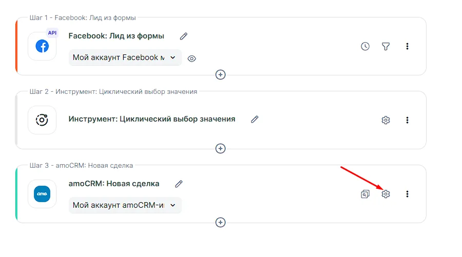 Когда лид поступает из рекламной кампании из сервиса Facebook*, по факту его поступления создается запись в amoCRM. Во время настройки интеграции вы хотите, чтобы лиды прилетали не на одного сотрудника из CRM-системы, а распределялись равномерно по всем сотрудникам. Для этого вы добавляете инструмент, а далее он циклическим способом будет распределять лиды по каждому из сотрудников, указанных в списке.