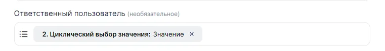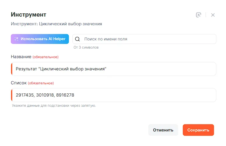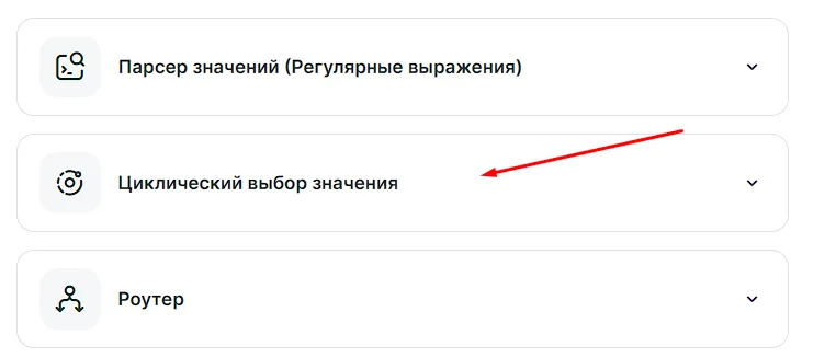 Для использования инструмента «Циклический выбор значения» вам необходимо найти инструмент в разделе «Конструктор связки» и добавить его между шагами.