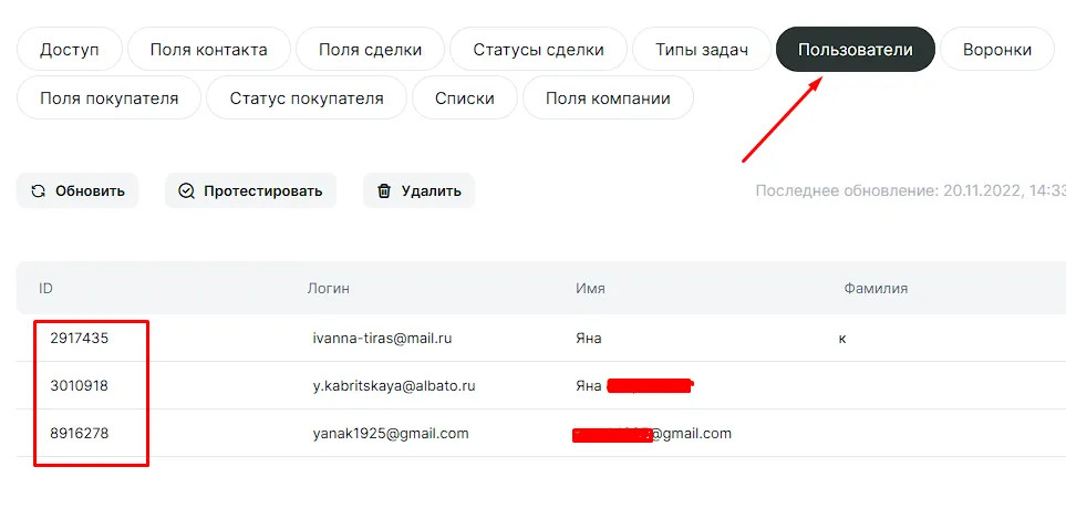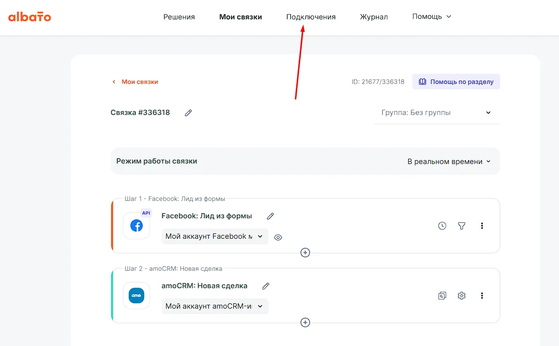 В случае с CRM-системой, который мы приводили в качестве примера, нужно указать список id номеров сотрудников, на которых будут распределяться лиды. Указать имена будет недостаточно, поскольку CRM-система принимает данные только в виде системного id. Данные, которые нам нужны, доступны в разделе подключения. Переходим туда.
