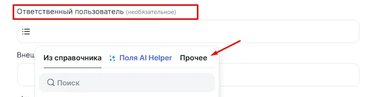 Находим поле «Ответственный исполнитель». Кликаем на него и в появившемся окне выбираем «Прочее».