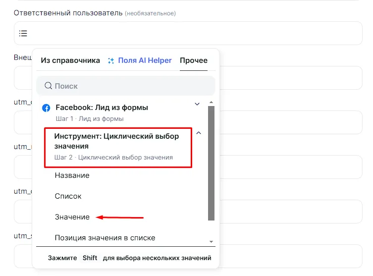 - «Значение» – конкретное значение из списка, которое будет передано при срабатывании связки;