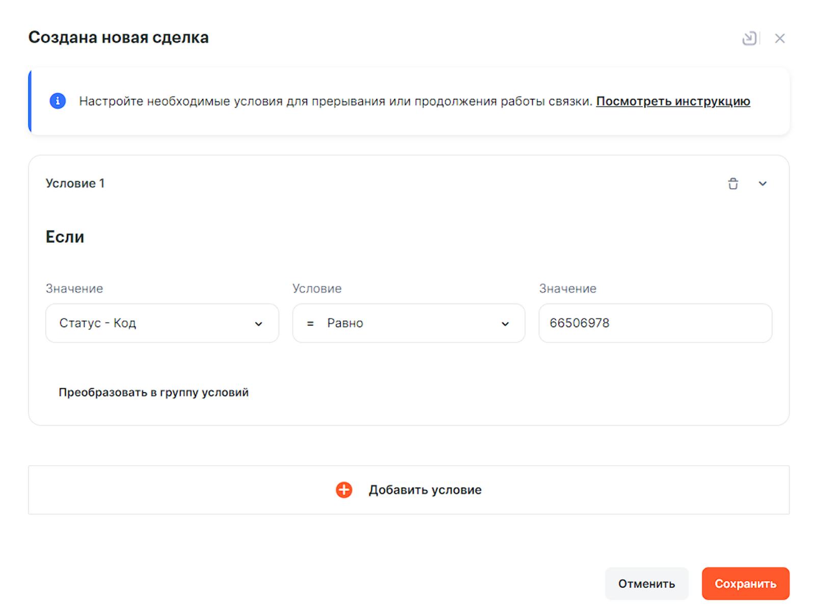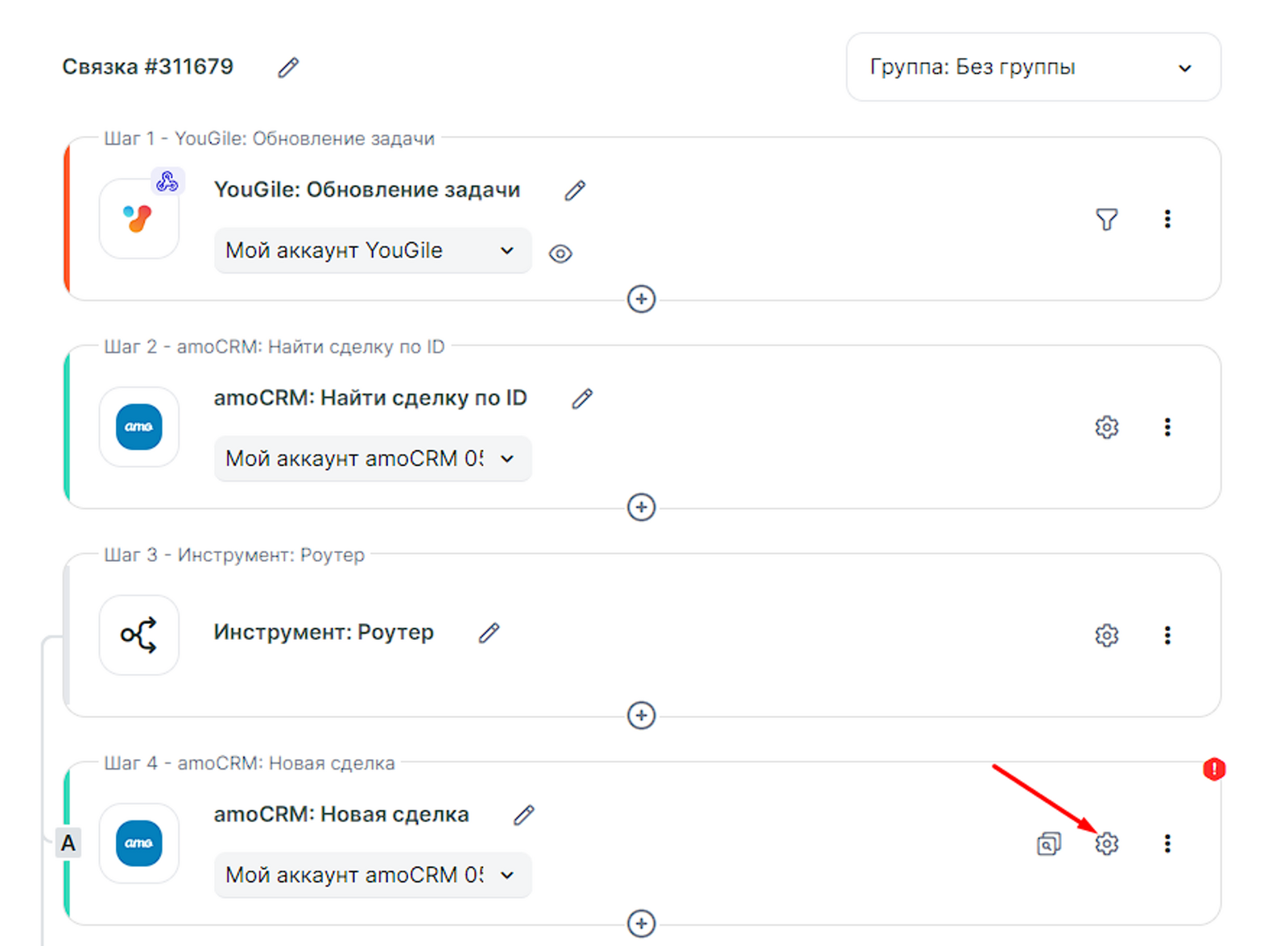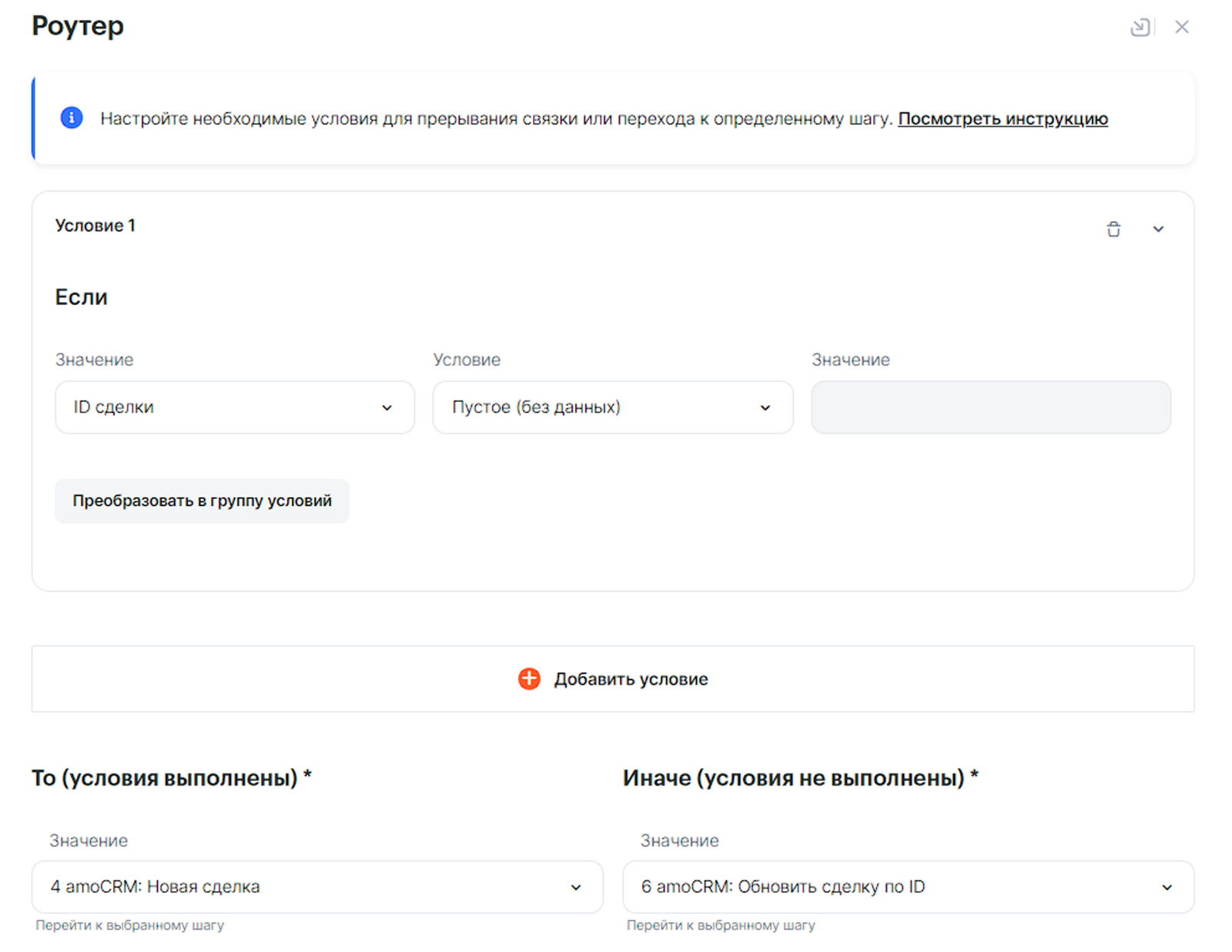 Настраиваем шаг, если ID сделки из шага 2 пустое, то переходим к шагу 4 создать сделку, иначе обновить: