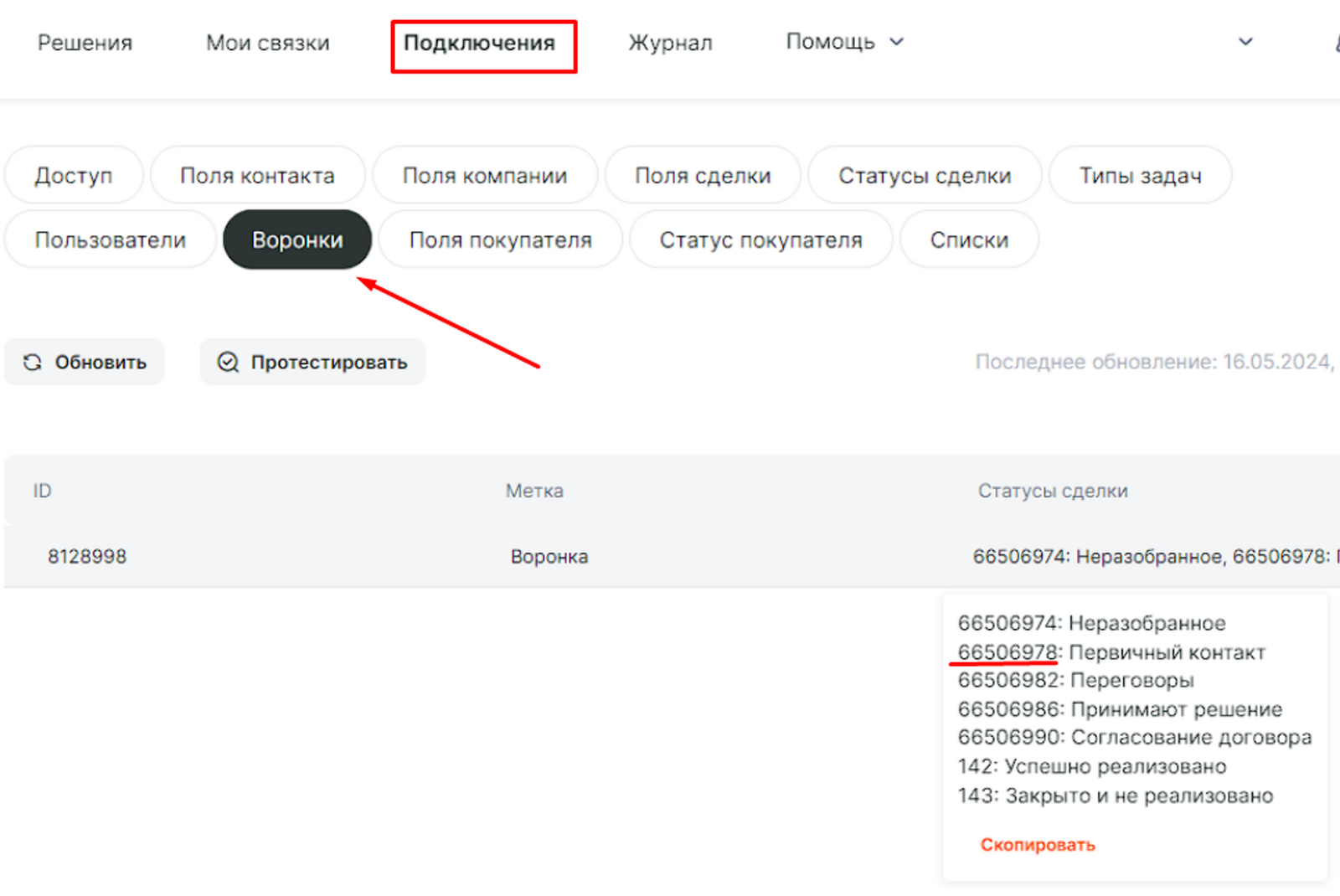 Для выбора статуса переходим в раздел Подключения — AmoCrm — Воронки: