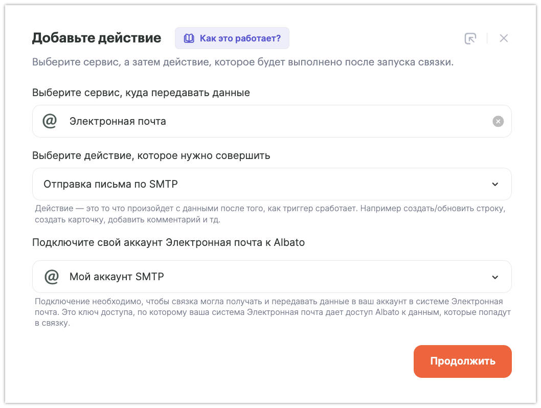 Например, если вы подключили к Albato несколько почтовых сервисов (mail, yandex, gmail и др.), а письма желаете отправлять через @mail.ru, убедитесь, что в третьем выпадающем списке выбрано подключение с нужной почтой: