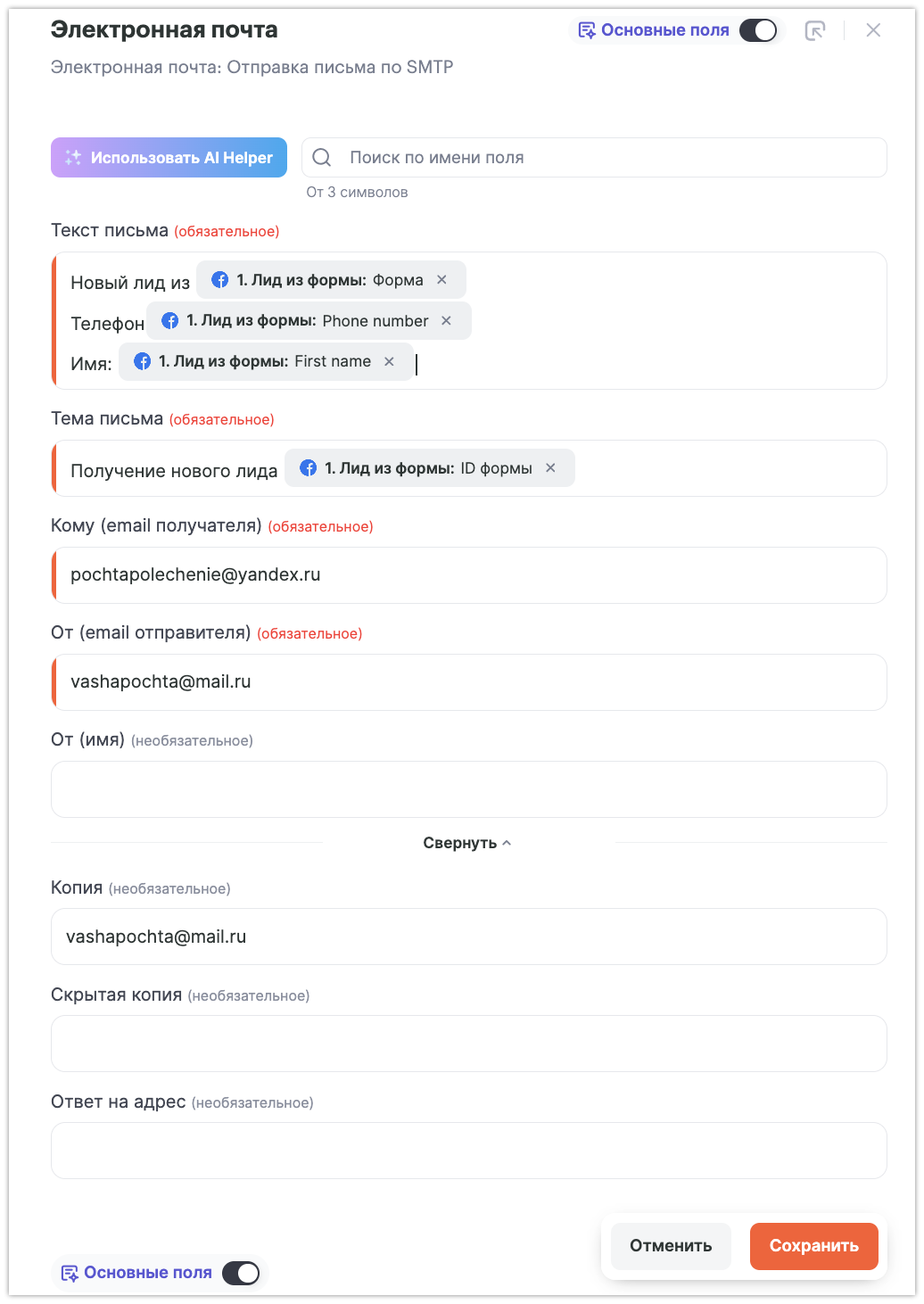 Связка «Facebook (Лид из формы) — Электронная почта (Отправка письма по SMTP)» довольно популярна, но все же ошибок при ее настройке допускается немало.