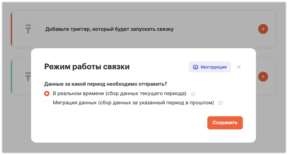 Чтобы получать новые лиды, выбираем «В реальном времени». Подробнее про режим «Миграция данных» можно прочитать в инструкции.
