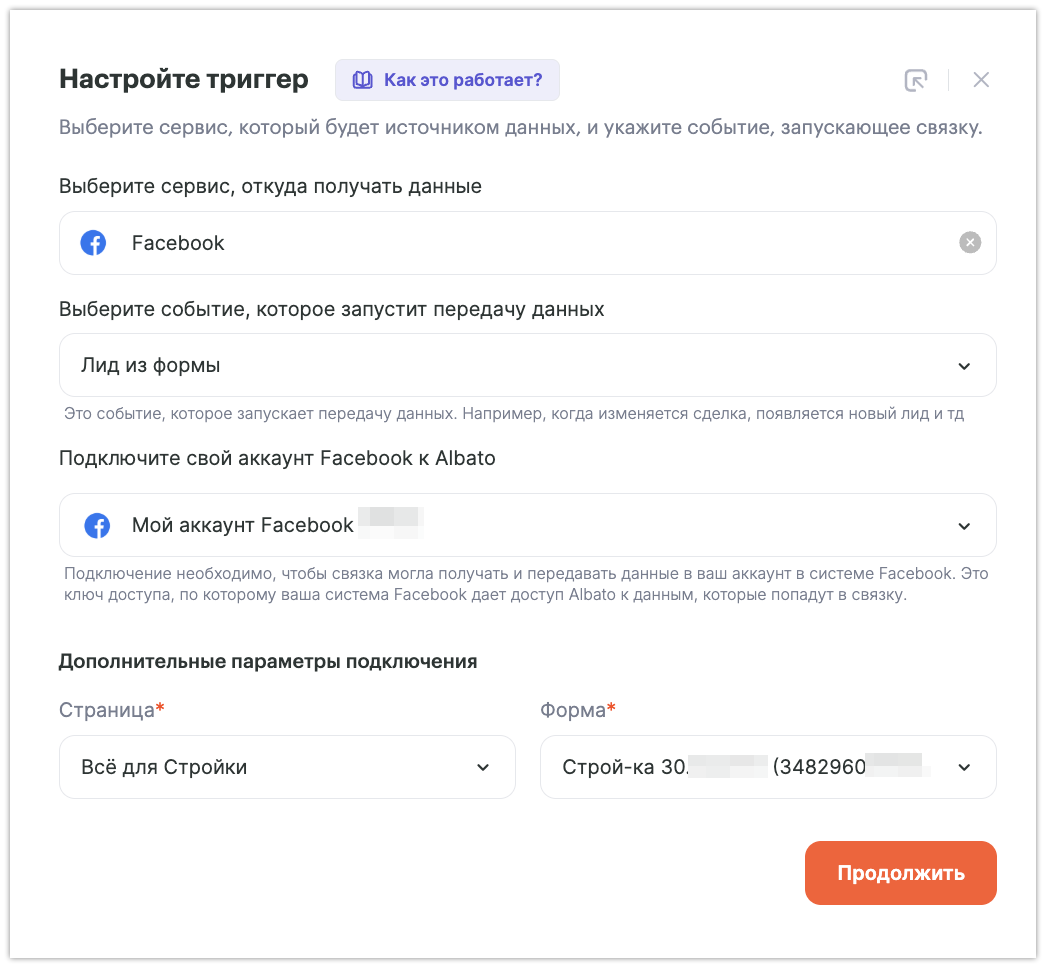 Выберите в первом выпадающем списке сервис «Facebook», во втором — событие «Лид из формы», а также укажите необходимое подключение. В «Дополнительных параметрах подключения» страницу и форму через которые планируем получать лиды: