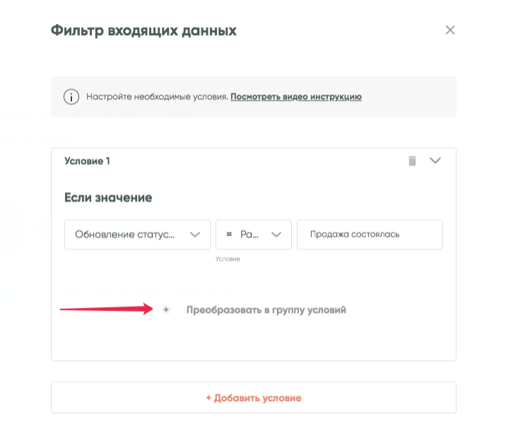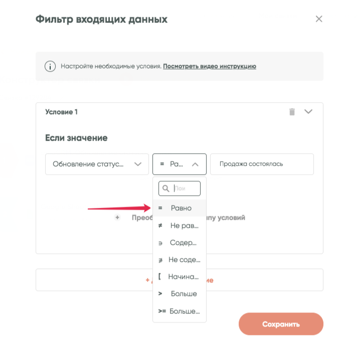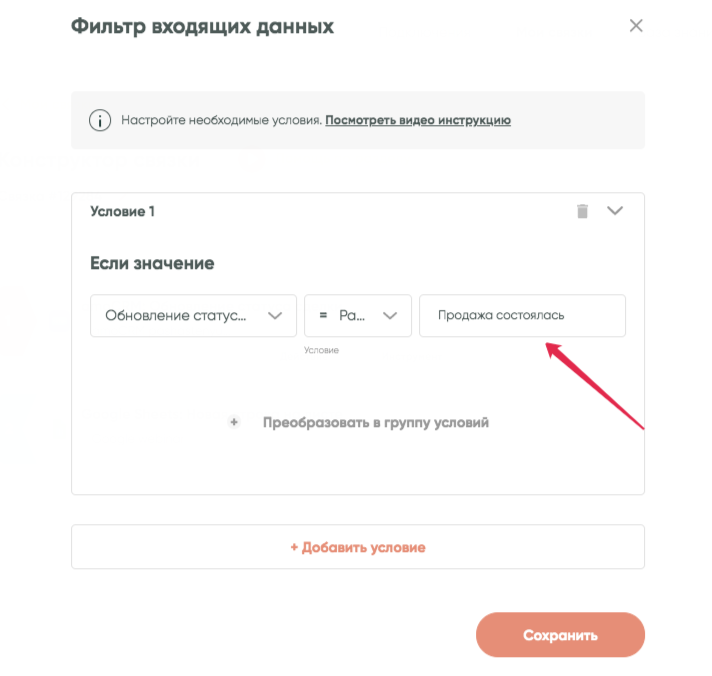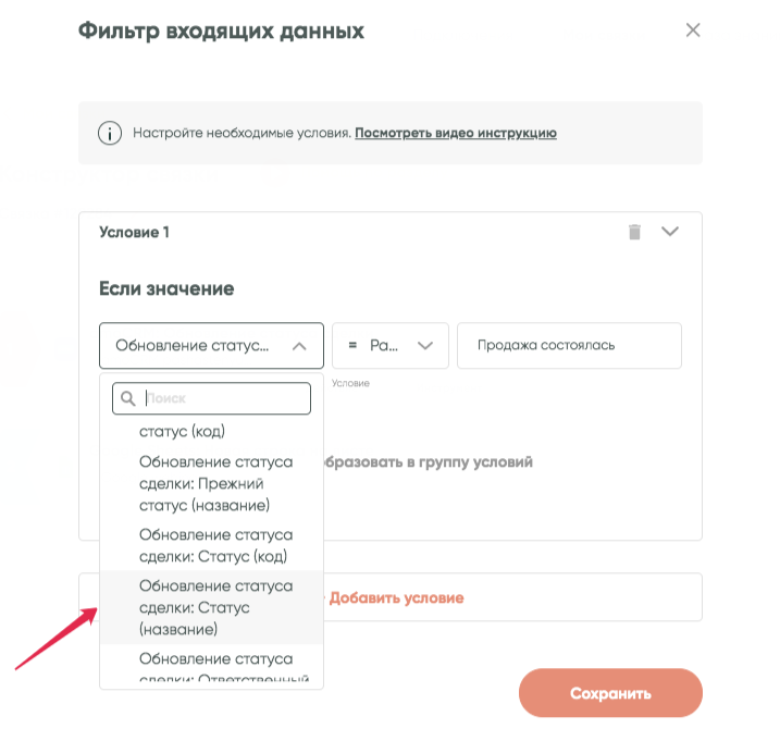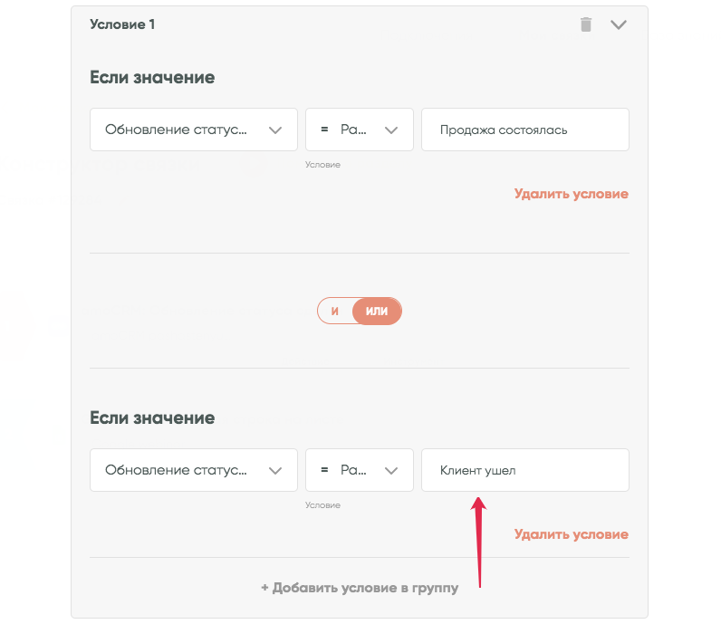 Нажимаем «Сохранить». Готово!Таким образом, связка продолжит работу только в том случае, если данные из передающего сервиса будут соответствовать указанному нами условию.Механизм проверки условия поддерживает также настройку сложных условий.Например, вы хотите, чтобы связка срабатывала при статусах сделки «Продажа состоялась» или «Клиент ушел». В этом случае можно преобразовать условие в группу условий: