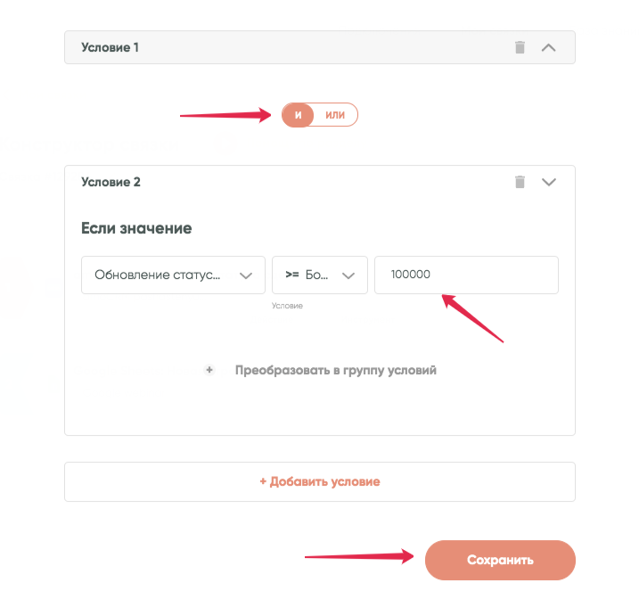 Теперь связка будет срабатывать только для сделок со статусом «Продажа состоялась» ИЛИ «Клиент ушел» И бюджетом сделки БОЛЬШЕ ИЛИ РАВНО 100 000 рублей.