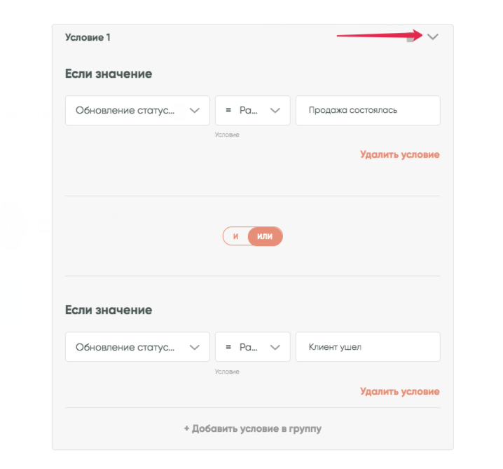 Допустим, вам нужно получать информацию только о крупных сделках с бюджетом более 100 000 рублей.Для этого к уже имеющейся группе условий добавьте еще одно условие. Для удобства можно свернуть первую группу условий с помощью кнопки в правом верхнем углу: