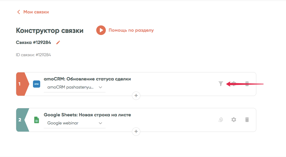 Фильтр находится в настройке первого шага любой связки. Получить доступ к нему можно на экране «Конструктор связки»: