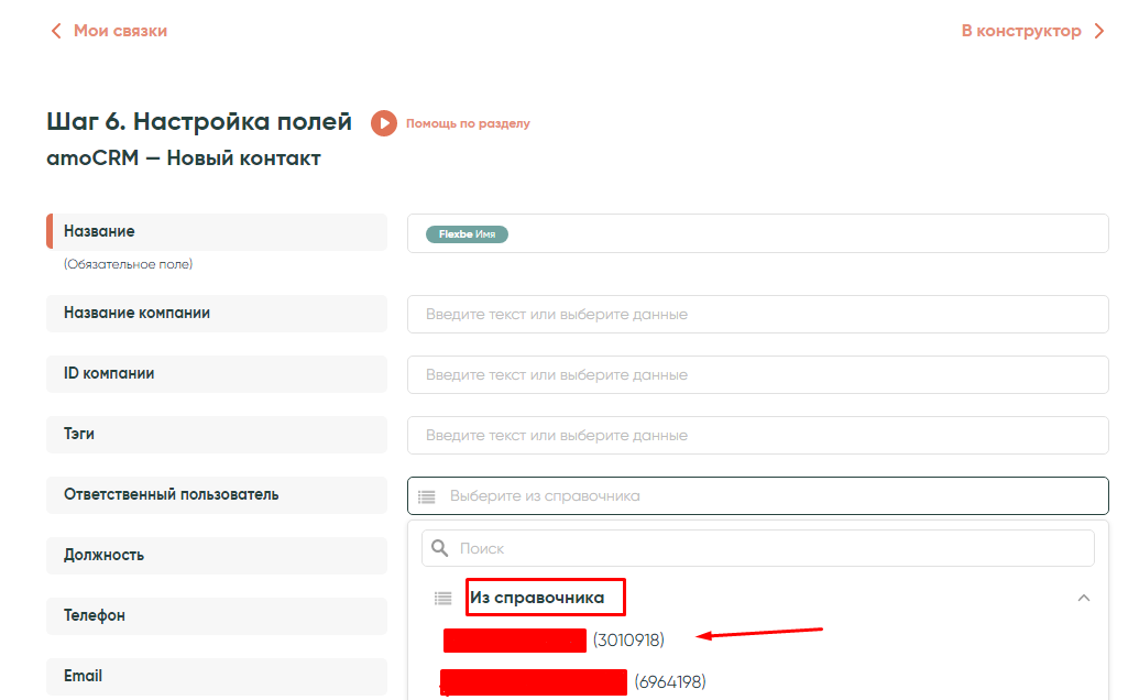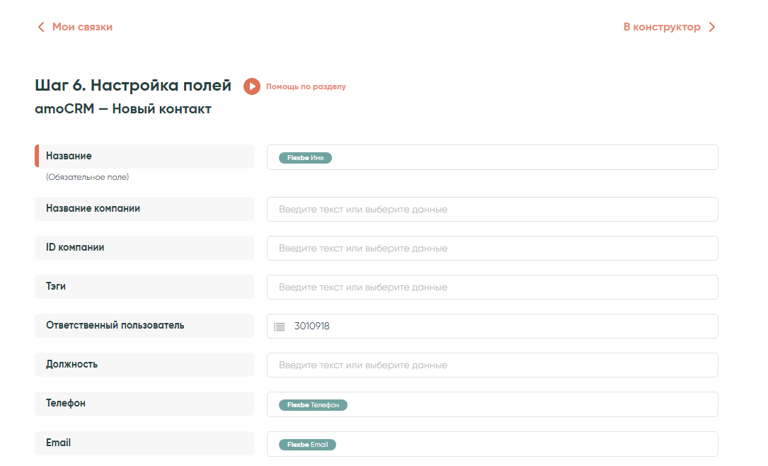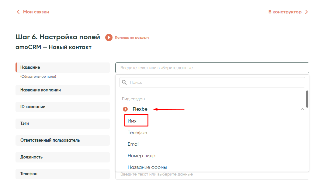 • Название контакта — параметр «Имя» из списочных значений Flexbe: