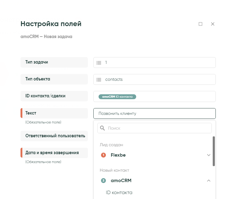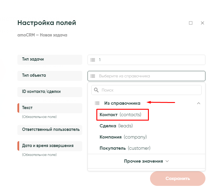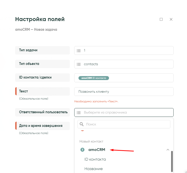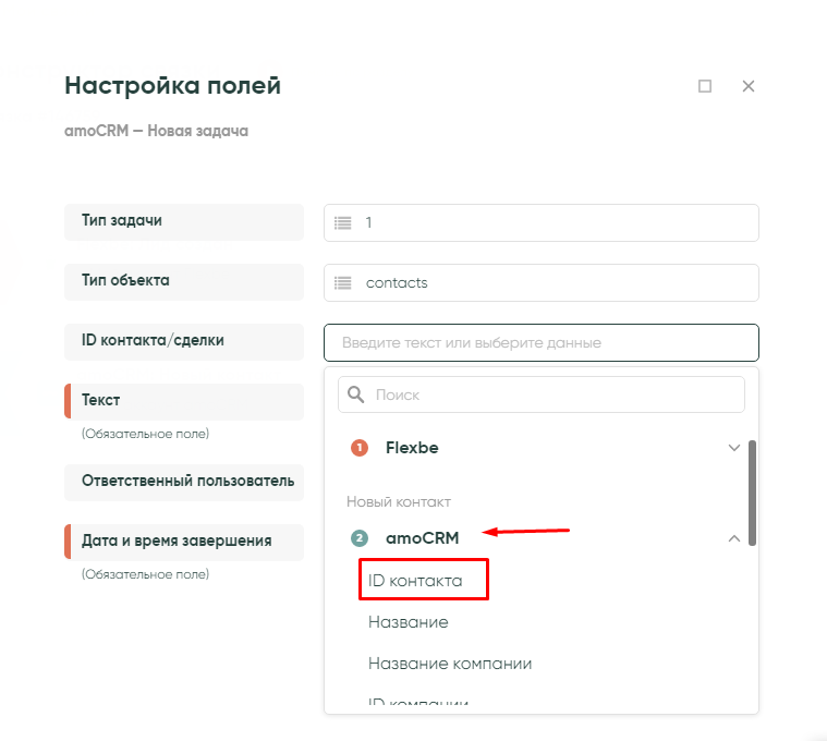 ID контакта/сделки — из выпадающего списка amoCRM — ID контакта