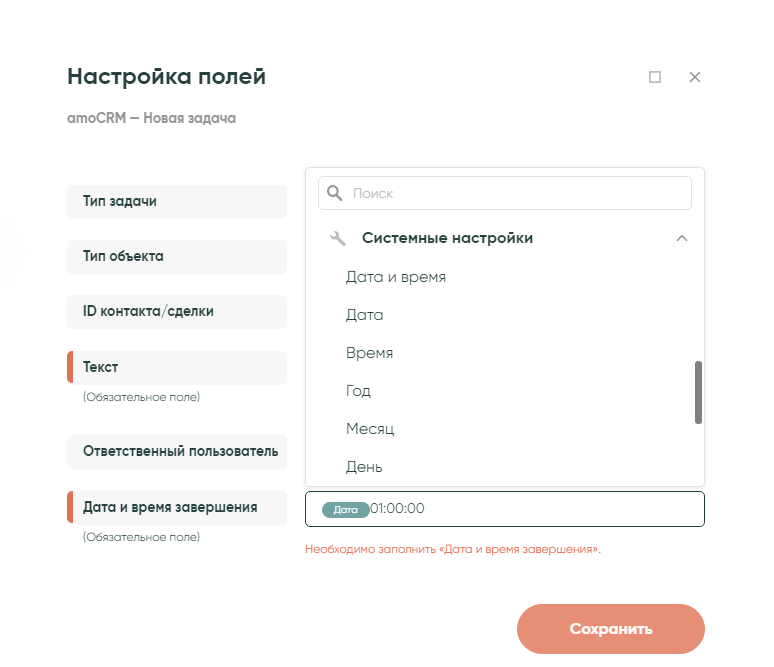 Дата и время завершения — параметр «Дата» из системных настроек и дописываем 01:00:00, при такой настройке задача будет завершена через 1 час после получения заявки из Flexbe.