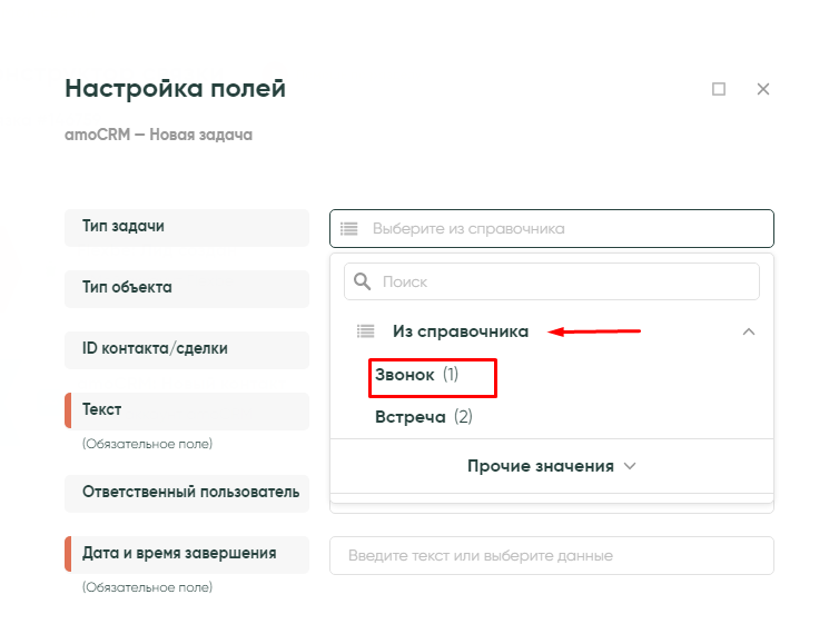 • Тип задачи — «Звонок» выбираем из значений справочника