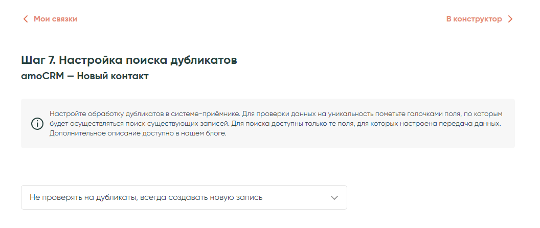 Шаг №7 Настройка проверки на дубли, мы выбираем — Не проверять на дубли, всегда создавать. Другие варианты описаны тут
