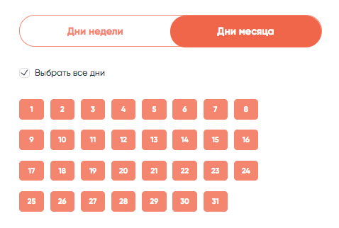Дни месяца (DaysOfMonth) – доступны параметры: время запроса (hh:mm — hh:mm), частота, дни месяцев. Запросы по связке идут в выбранные дни месяца, с выбранной частотой в указанный промежуток времени.