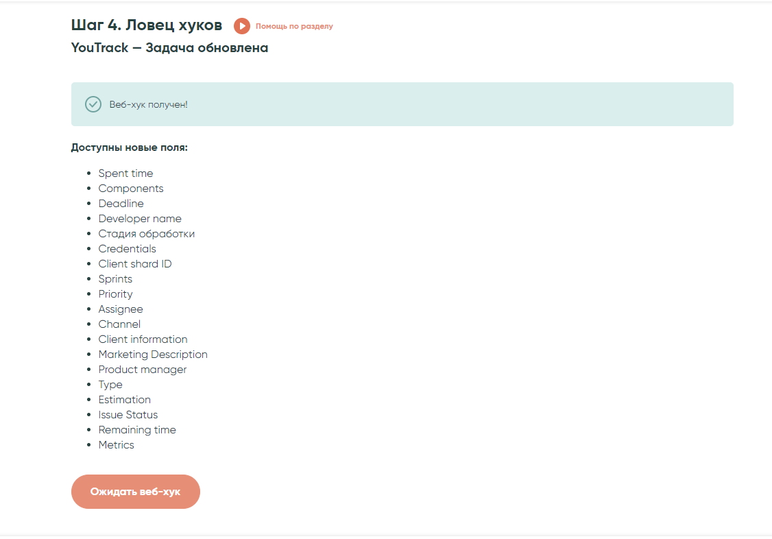 На шаге «Ловец хуков», вам необходимо нажать кнопку «Ожидать вебхук», затем инициировать то событие, которое было выбрано (создание или изменение тикета) в YouTrack. После, вы получите все поля вашего проекта: