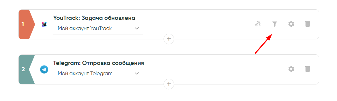 После основной настройки связки вы можете настроить дополнительные действия или инструменты. Для этого нажмите в «+» и выберите необходимый шаг, который необходимо совершить системе.