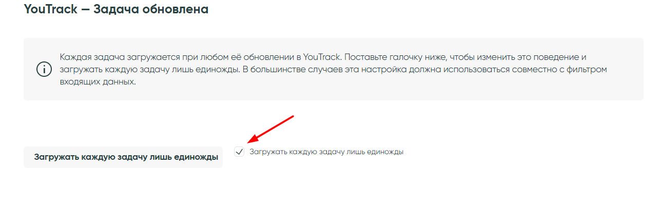 Если вы выбрали обновление, то на следующем шаге вы можете поставить галочку на «Загружать каждую задачу лишь единожды», если галочка стоит, то каждый тикет будет в одну связку попадать лишь один раз без повторного попадания.