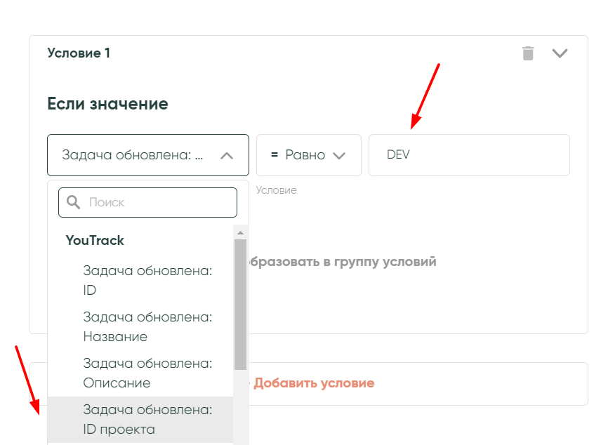 Добавьте условие и выберите ID проекта, выберите условие «равно», а в правом поле, пропишите айди вашего проекта в YouTrack: