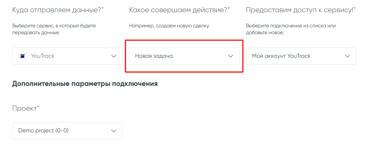 В Albato есть возможность передавать данные в YouTrack, чтобы сервис выполнял действие по постановке задач.