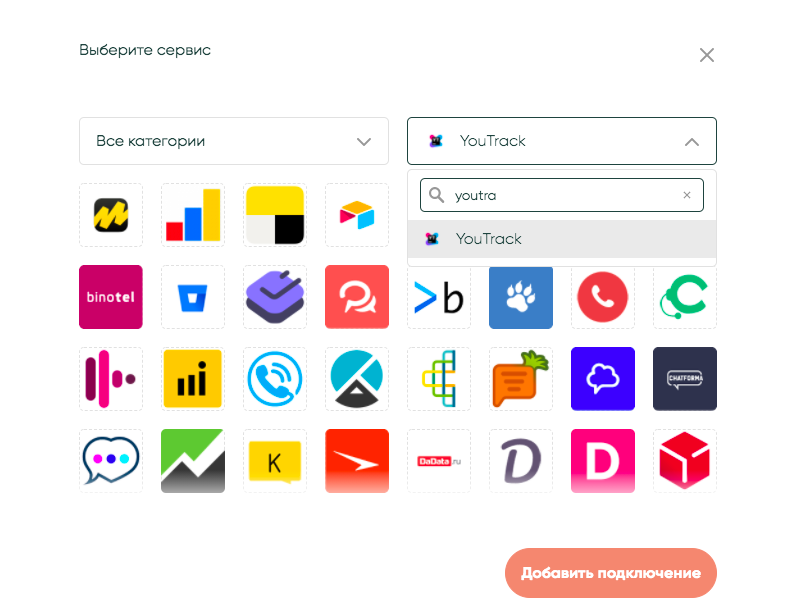 Выберите из списка сервисов категорию «Другое» или воспользуйтесь поисковой строкой, чтобы быстрее найти YouTrack и нажмите «Добавить подключение».