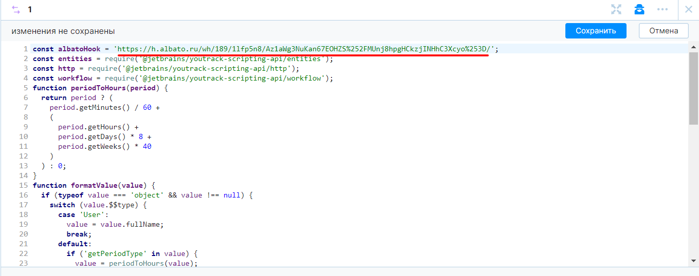 «const albatoHook = ‘{{albatoHook}}’;», значение {{albatoHook}}, на реальный вебхук из созданного ранее подключения. Скопируйте вебхук, из вашего созданного подключения в Albato.