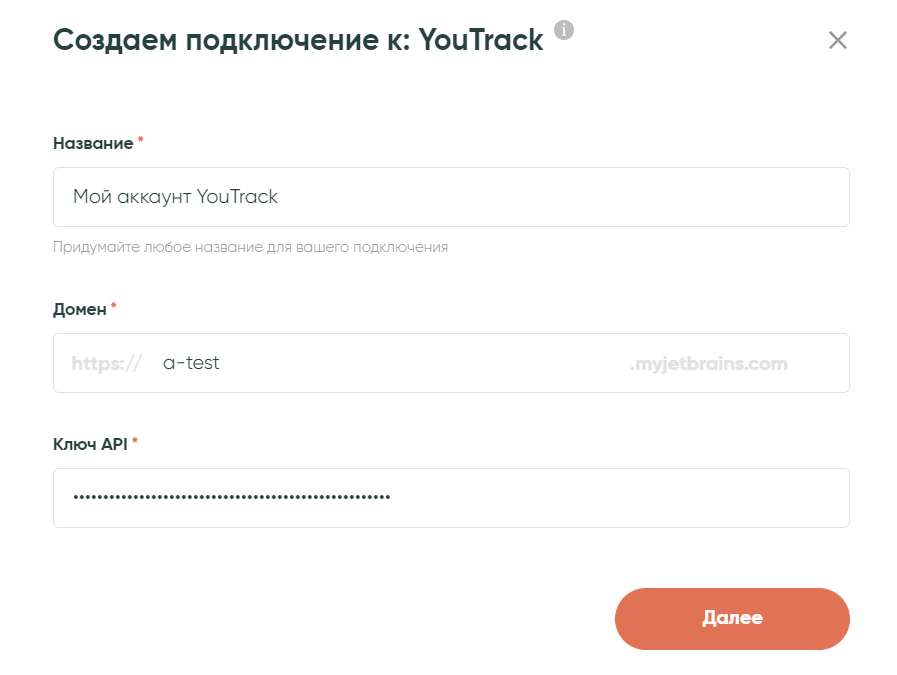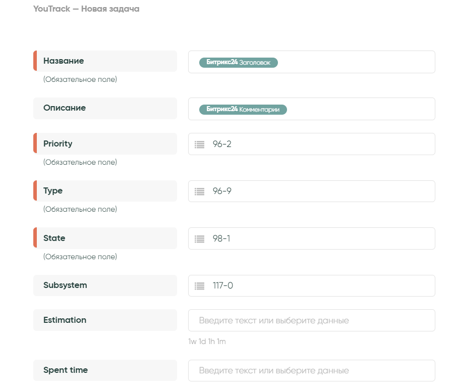 На следующем экране настройки полей нужно заполнить, используя данные из самого сервиса YouTrack.