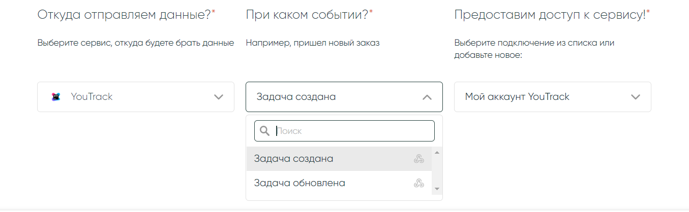 На первом этапе создания связки выберите сервис, из которого хотите получать данные, а на этапе выбора сервиса, куда передавать данные выберите YouTrack:
