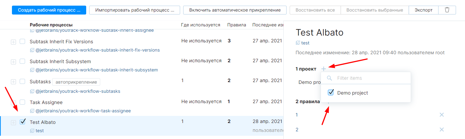 Далее вам нужно привязать ваш Workflow к нужному вам проекту. Для этого вернитесь в список ваших Workflow, выделите созданный вами Workflow и привяжите его к нужным проектам: