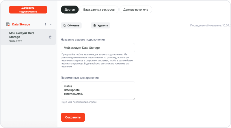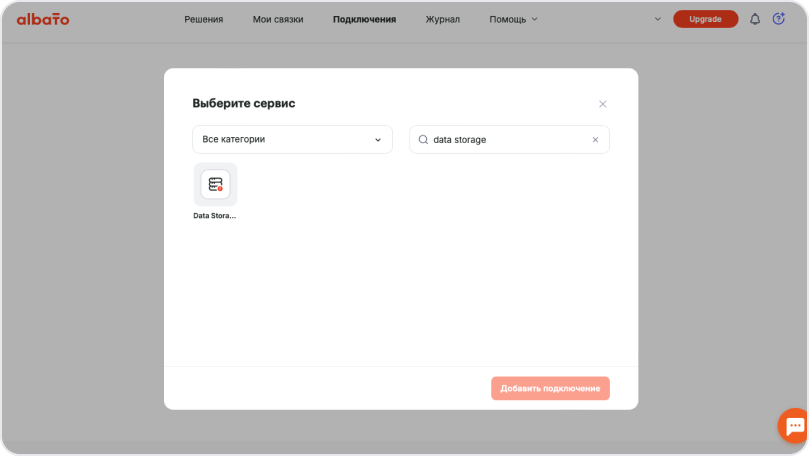 Для использования Data Storage первым шагом будет создание подключения. Для этого перейдите в раздел “Подключения” и нажмите кнопку “Добавить подключение“.
