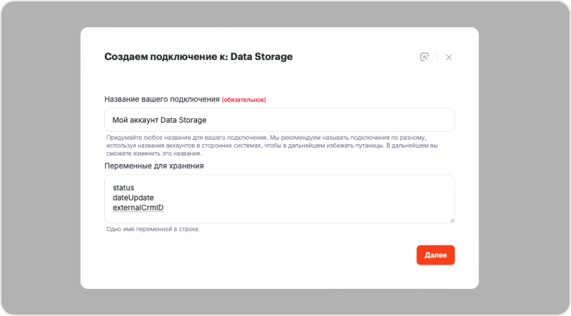 Например, если мы хотим получать сделки из CRM и хранить их идентификатор, статус, дату обновления, а также внешний ID от другой CRM в одной записи, нам необходимо задать 3 переменные. Для идентификатора сделки будем использовать ключ записи.