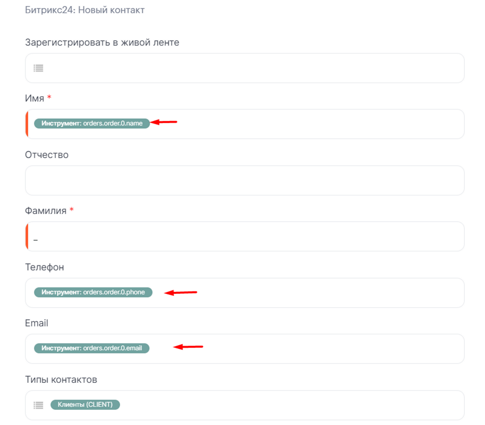 В следующий шаг (Б24 Новый контакт) уже будем передавать отдельные переменные.