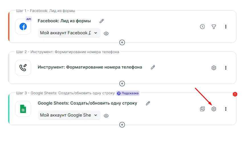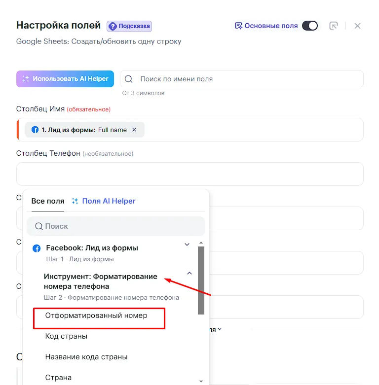 После настроек шага «Форматирование номера телефона» добавьте получившийся номер телефона в следующий шаг принимающей системы. В нашем случае это CRM система Google Sheets