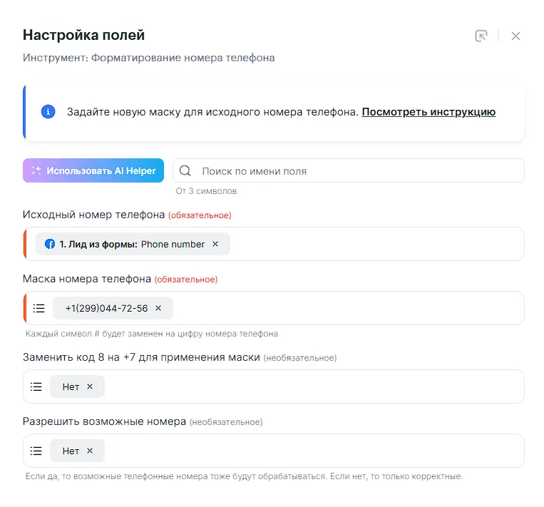 Он пригодится, если телефоны поступают из разных источников в разных форматах. С помощью этого инструмента номера форматируются и приводятся к одному виду.