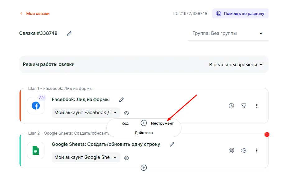 Найдите инструмент в разделе «Конструктор связки» и добавьте его между шагами.